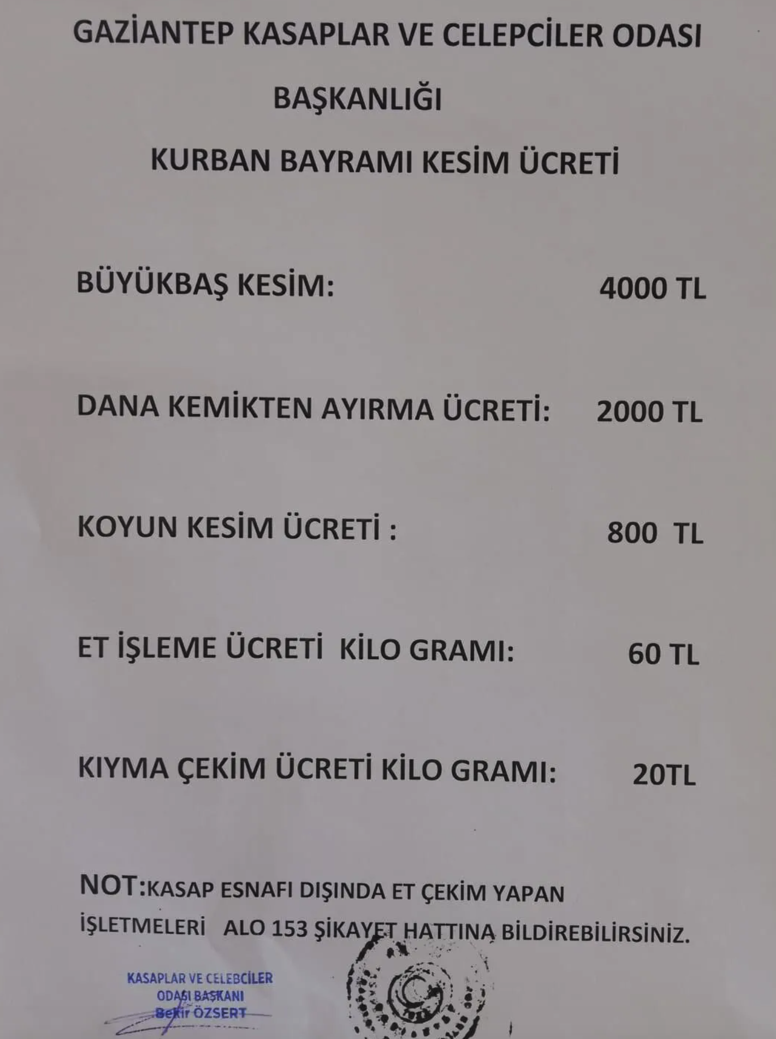 Gaziantep Kasaplar ve Celepciler Odası Başkanı Bekir Özsert, kurban kesim ücretlerini açıkladı. Özsert, “Gaziantep Kasaplar ve Celepciler Odası tarafından açıklanan Kurban Kesim Ücretlerini; Büyükbaş kesim için 4000 TL, Dana Kemikten Ayırma 2000 TL, Koyun Kesim 800 TL, Et İşleme Kilogramı 60 TL ve Kıyma Çekim Ücreti Kilogram başına 20 TL olarak belirledik” dedi.