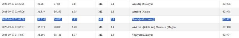 Yaşanan bugünkü depremlere ilişkin peş peşe açıklamalar yapan Kandilli Rasathanesi ve Deprem Araştırma Enstitüsü ile Afet ve Acil Durum Yönetimi Başkanlığı (AFAD), bugün saat 09.30’a kadar gerçekleşen tüm depremleri duyurdu. Kandilli Rasathanesi ve Deprem Araştırma Enstitüsü ile AFAD’ın liste halinde paylaştığı depremler arasında Gaziantep ve çevresini etkileyen depremler de yer aldı.