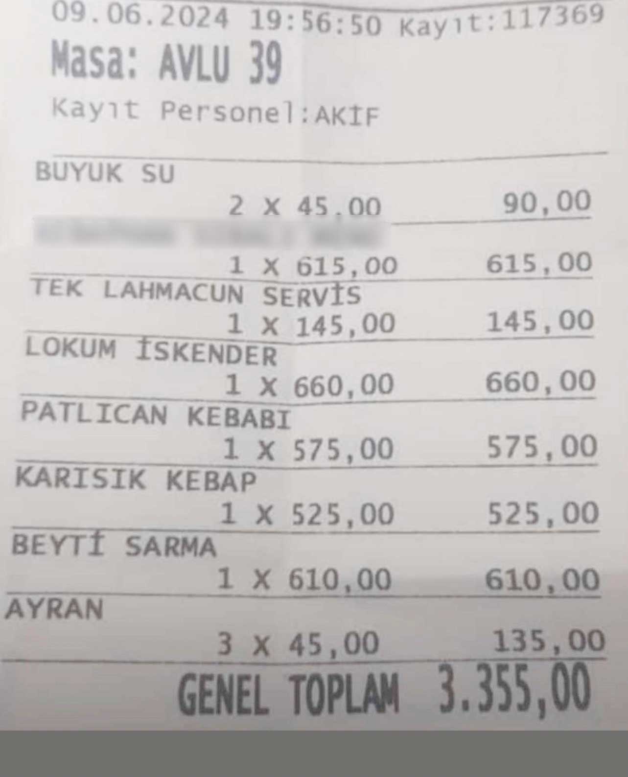 Gaziantep'te sosyal medyaya düşen lokantaya ait hesap fişi rakamı dudak uçuklattı. Büyük su 45 TL, bir lahmacun 145 TL, Lokum İskender 665 TL, bir patlıcan kebabı 575 TL, bir ayran 45 TL ve daha neler neler. Gaziantep'te lokantada çıkarılan hesabı görenler: 'Bu Lokanta Gaziantep'te mi, Bodrumda mı 3335 TL'lik hesap nedir?' diye tepki gösterdi. Sosyal medyada lokantanın hesap fişine yüzlerce yorum geldi...